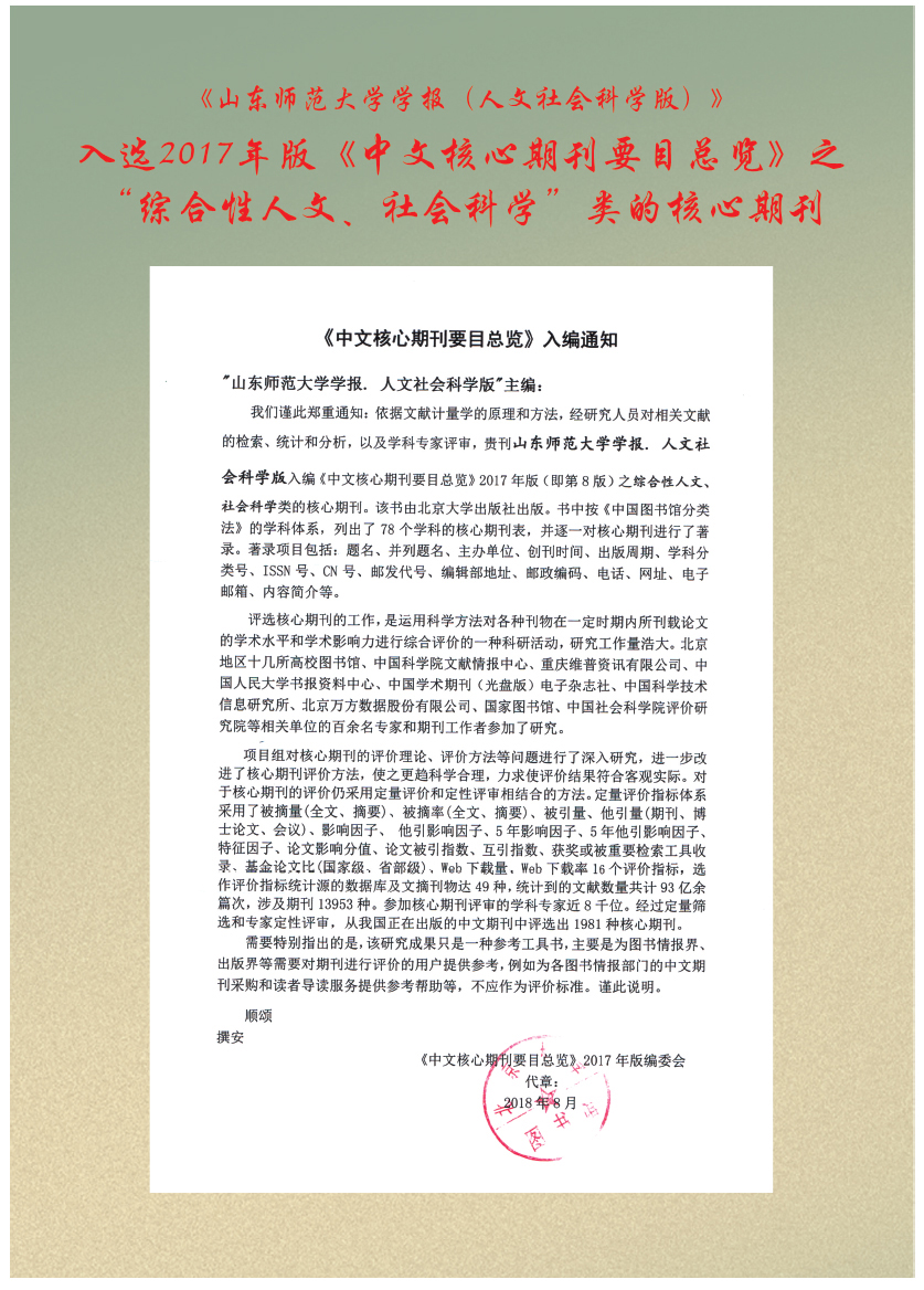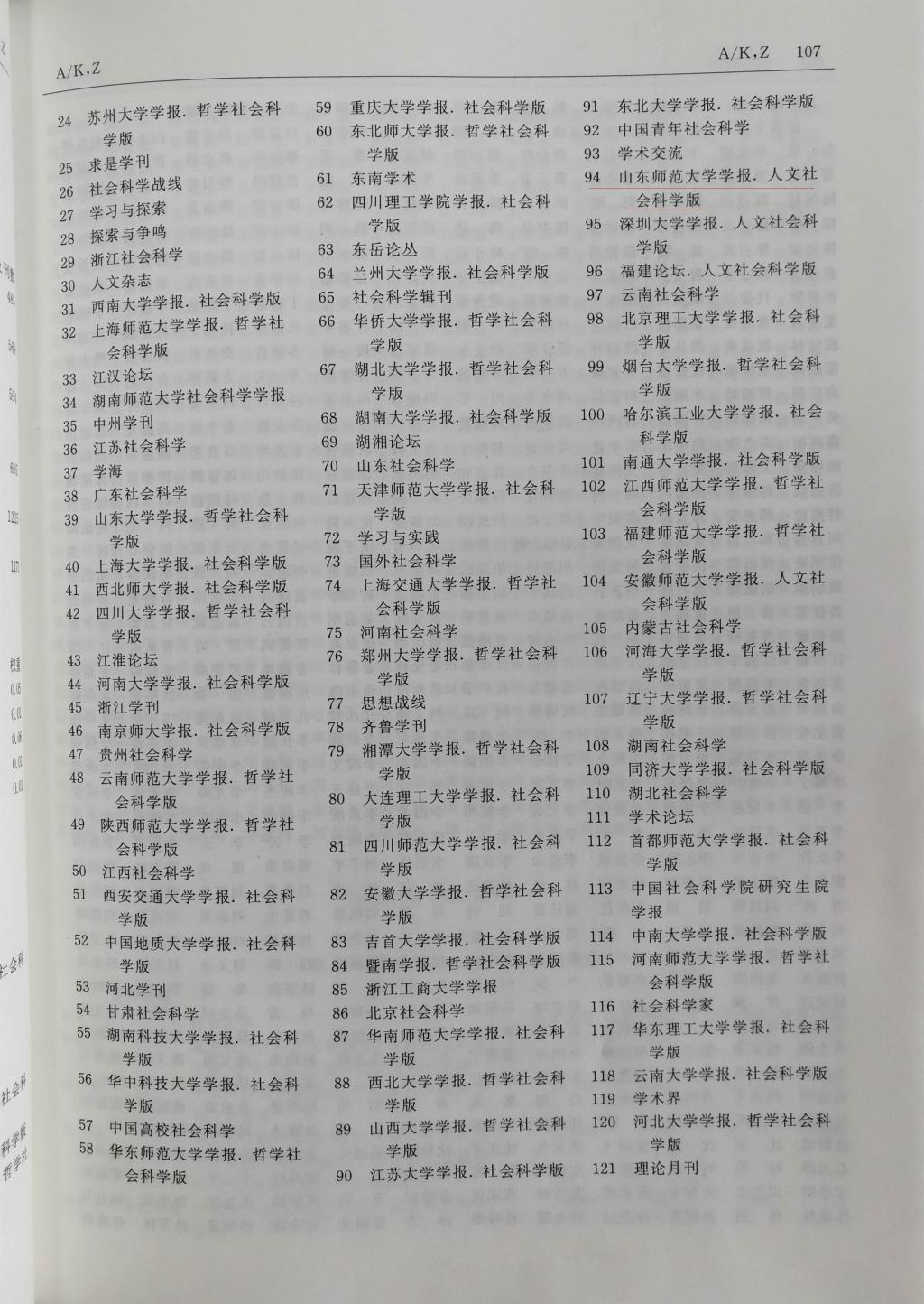山东师范大学学报在综合人文、社会科学类核心期刊排名中列第94位