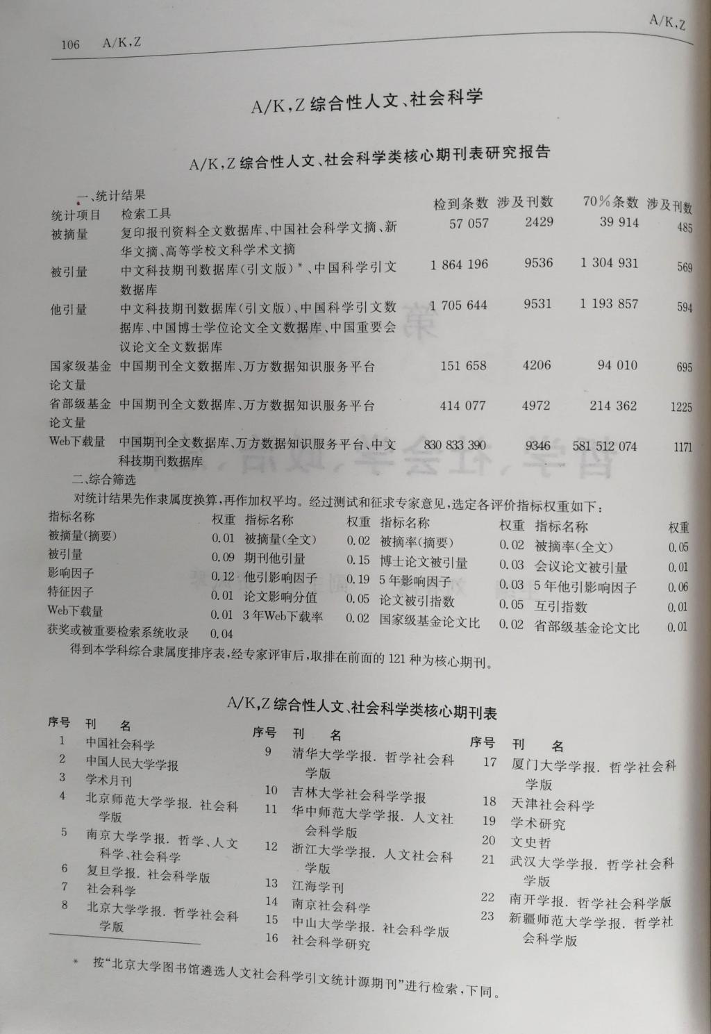 综合人文、社会科学类核心期刊排名
